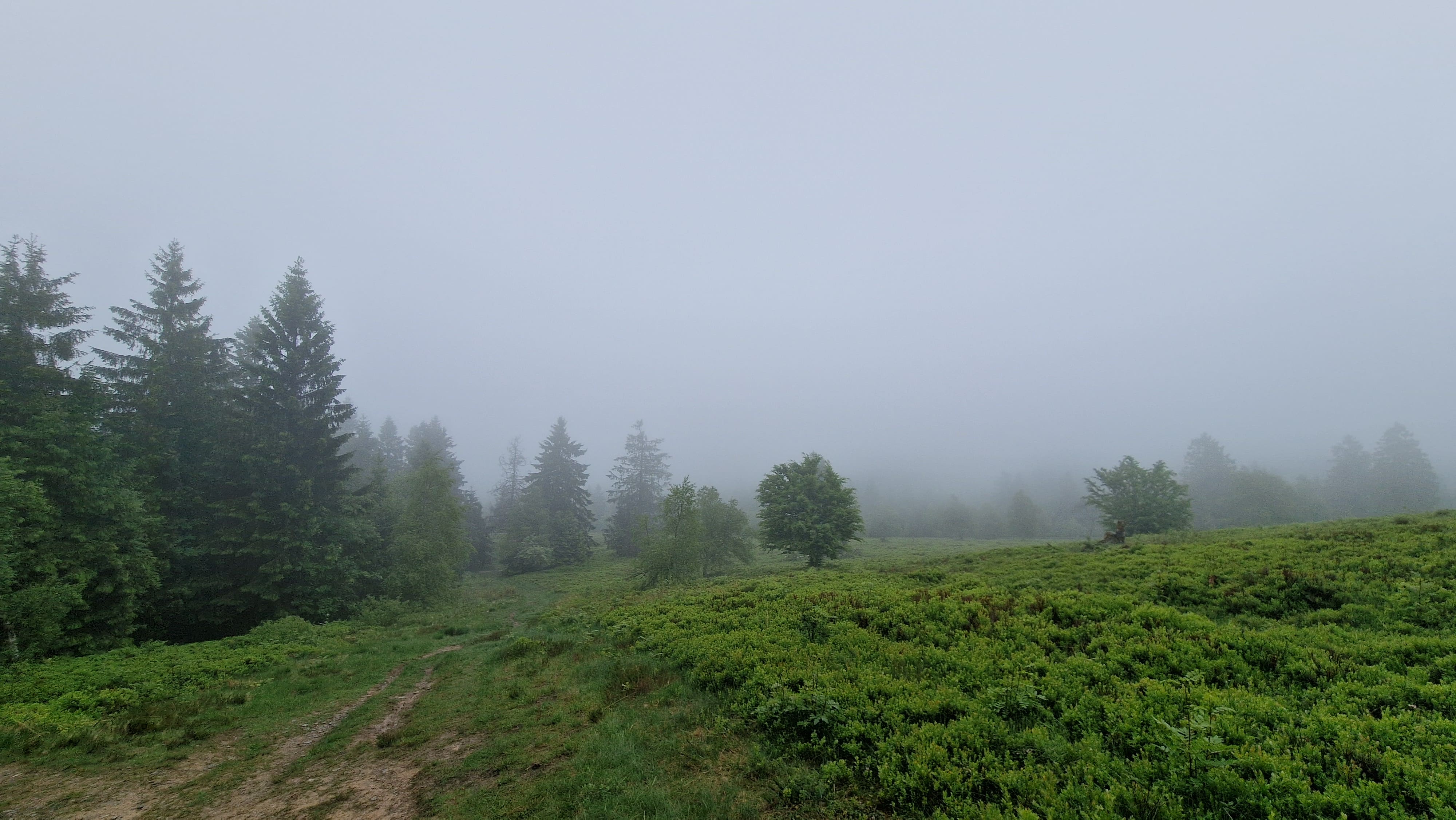 As I climbed higher, the weather started shifting. Clouds gathered, darkening the sky behind me. And then I saw itâlightning flashing across the horizon. My pace quickened, adrenaline kicking in. Just when the first drops began, I spotted a small wooden shelter and made it there just in time. Moments later, rain poured down in sheets, and thunder echoed through the hills. Once the storm moved on, a thick fog rolled over the landscape, turning the hills into a quiet, mysterious world.
