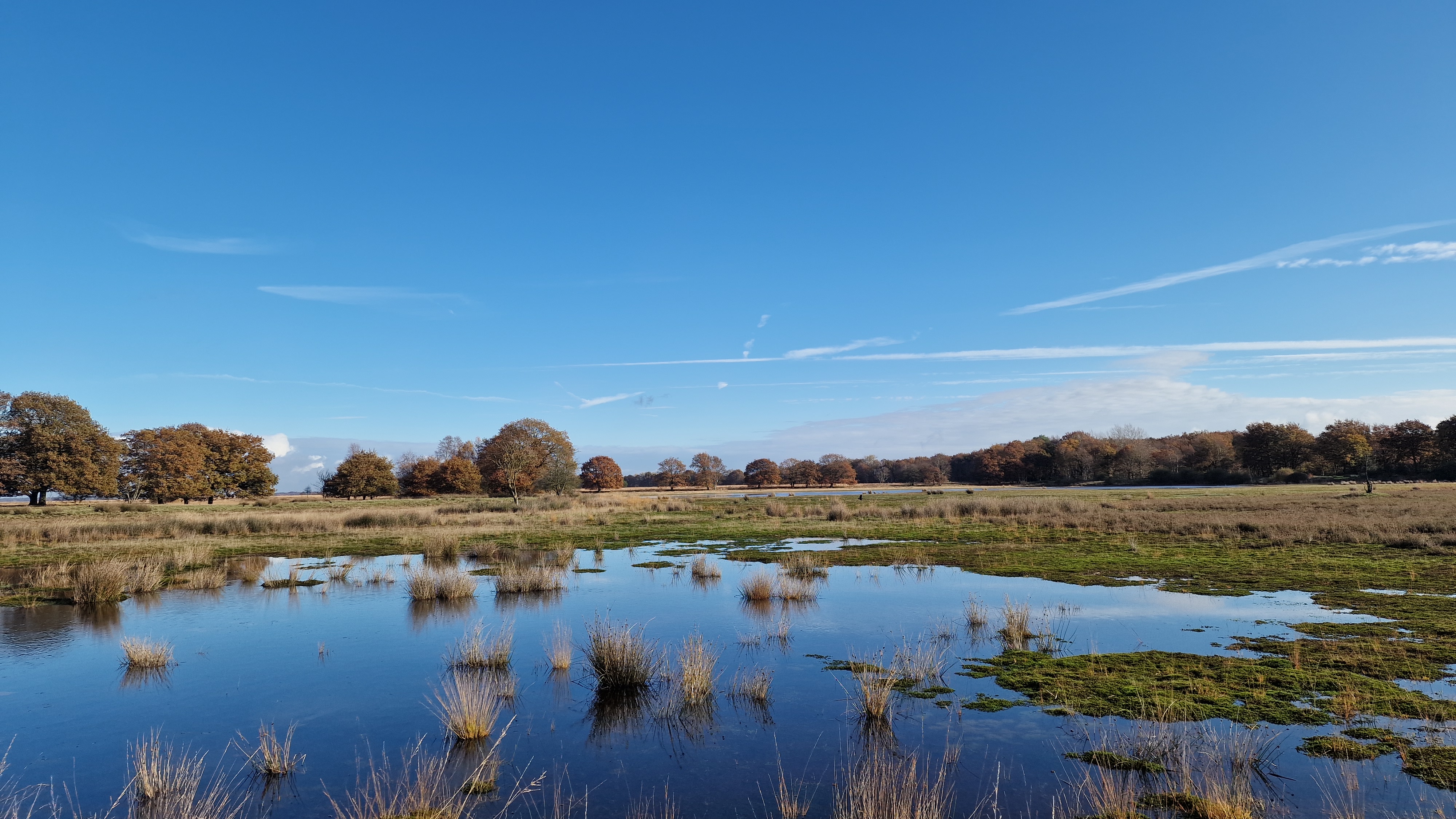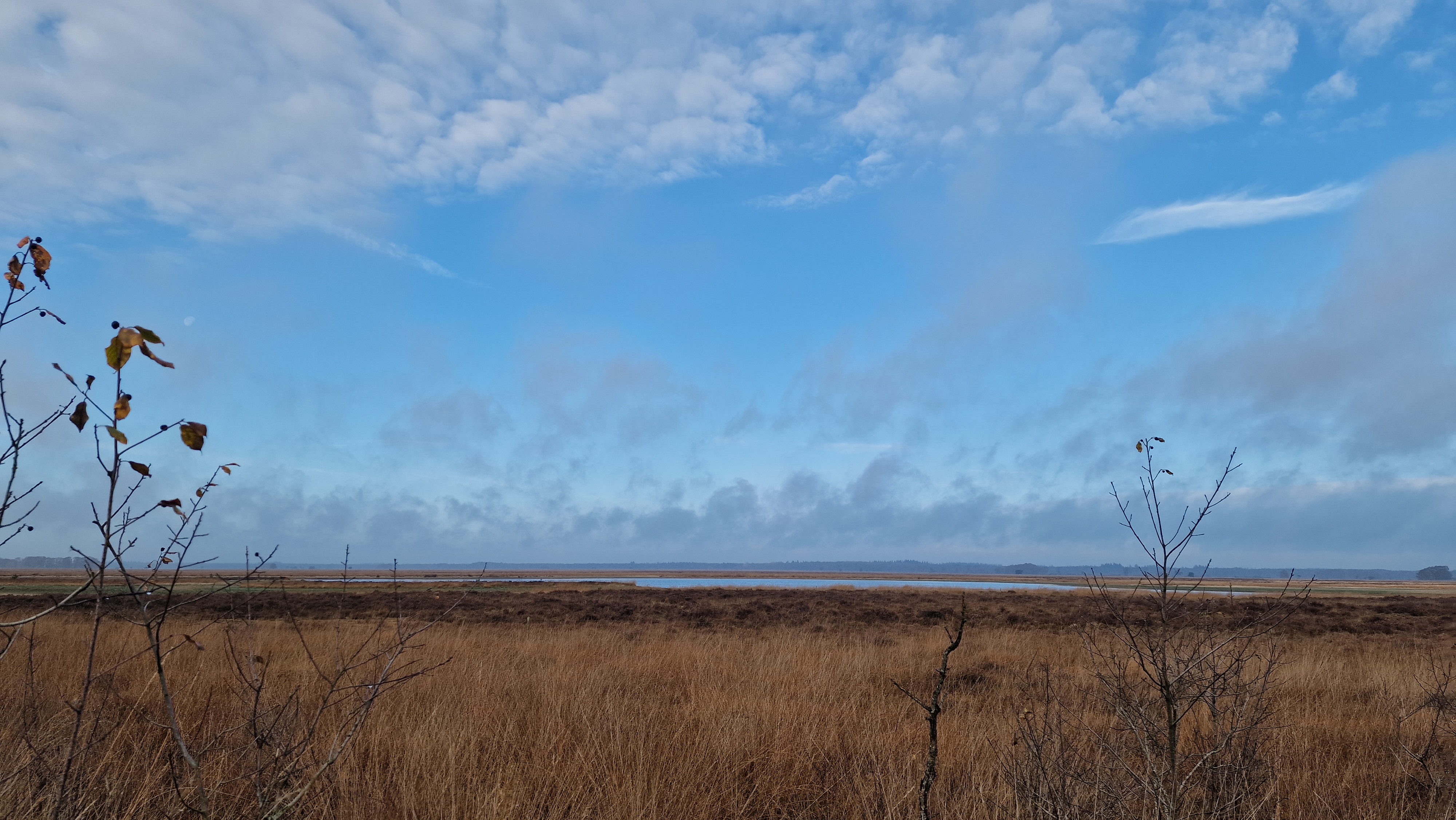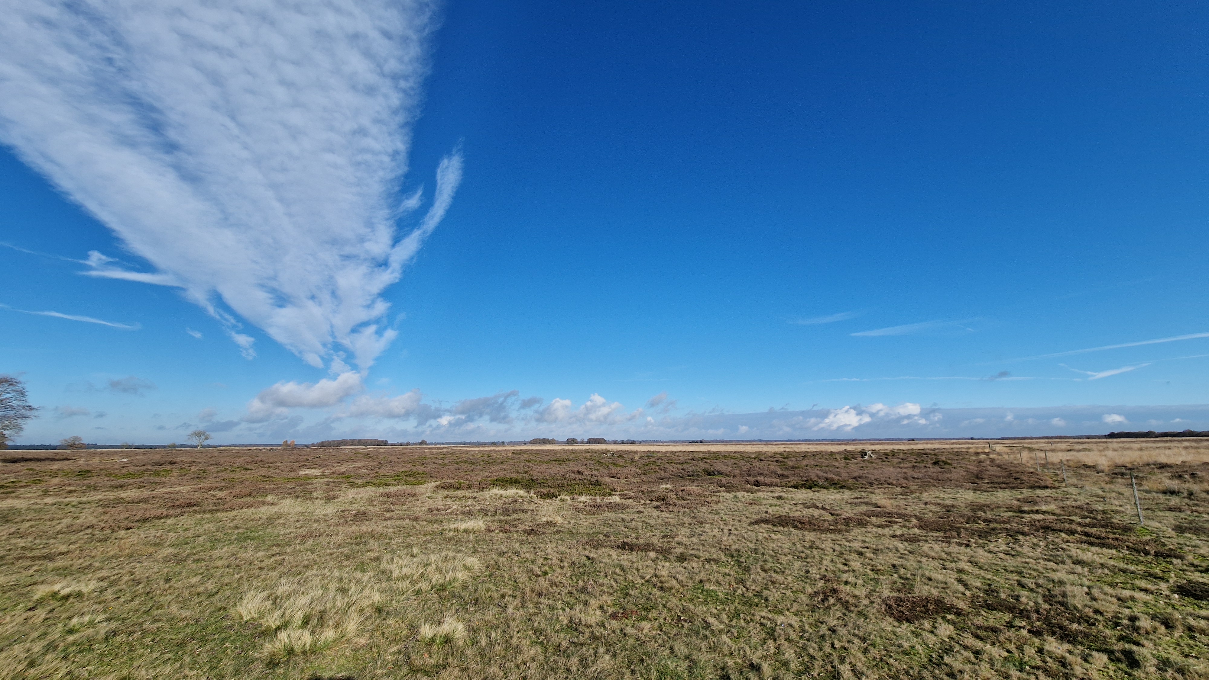 The landscape here is vast and open, a mix of heath, forest patches, and quiet pools of water that mirror the changing sky. In the early hours, spider webs glistened with dew between the heather, and the smell of damp earth filled the air. Every now and then, a lone tree or a wooden fence would appear out of the fog — like a painting slowly revealing itself.